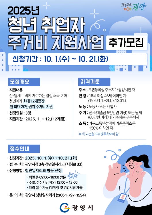 자세한 내용은 광양시청 홈페이지 공지사항 및 공고란에서 확인할 수 있으며, 문의는 청년일자리과 청년정책팀으로 하면 된다.