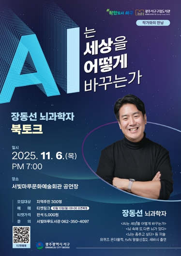 1부 강연에서는 인공지능의 발전과 활용 사례, 사회문화 전반에 미칠 영향력 등을 중점적으로 다루며 디지털 전환 시대에 요구되는 인간의 역할과 가치에 대한 통찰을 전할 예정이다. 2부 대담에서는 김이강 서구청장이 직접 진행자로 나서 장 박사와 함께 인공지능을 비롯한 다양한 주제에 대해 진솔한 대화를 나눈다.