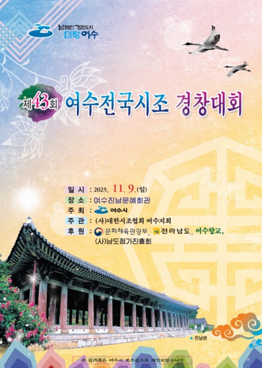 이번 대회는 여수시가 주최하고 (사)대한시조협회 여수지부(대표 송정숙)가 주관하며 우리 고유의 전통 성악 예술인 시조창의 계승·발전과 역량 있는 신인 발굴을 목적으로 추진된다.