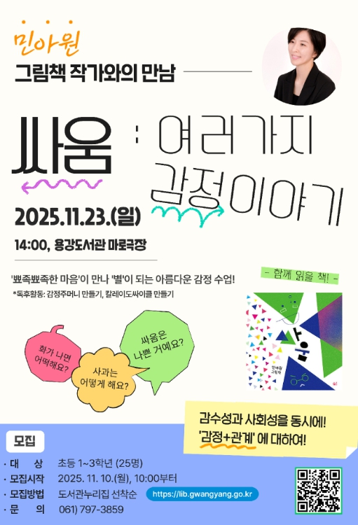 ‘싸움: 여러 가지 감정 이야기’를 주제로 한 이번 작가와의 만남은 어린이들의 감수성과 사회성을 높이고, 건강한 자아와 관계 형성에 도움을 주기 위해 마련됐다.