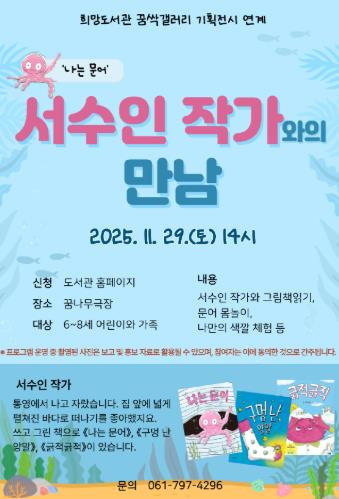 작가와의 만남 행사에서는 ▲작가의 그림책 낭독 ▲그림책 제작 뒷이야기 소개 ▲질의응답 및 사인회와 함께, 작품의 주제를 바탕으로 한 ▲‘문어와 진주’ 몸놀이 ▲‘나만의 색깔 만들기’ 체험활동 등 다채로운 프로그램이 진행될 예정이다.