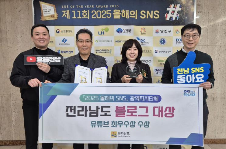 전남도는 26일 ‘2025 올해의 SNS’에서 광역자치단체 블로그 ‘대상’과 유튜브 ‘최우수상’을 받았다.