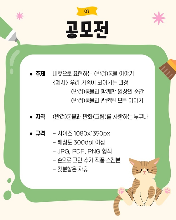 이번 공모전은 동물과 만화(그림)에 관심 있는 누구나 참여할 수 있으며, 반려동물과 일상에서 겪는 재미있고 따듯한 순간을 네컷만화로 표현하면 된다.