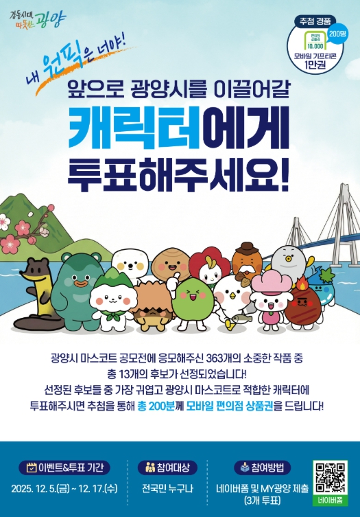 투표는 전 국민 누구나 참여할 수 있으며, 광양시를 상징할 수 있고 시민에게 친근함과 호감을 줄 수 있는 캐릭터 3개를 선택해 제출하면 된다.
