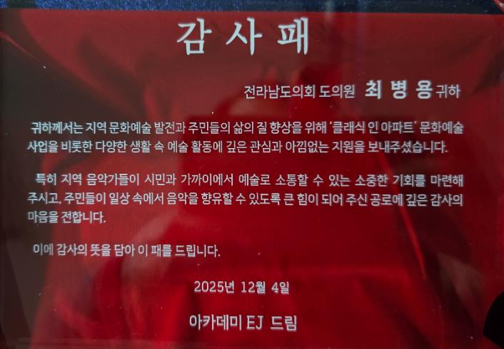 최병용 의원은 “이번 감사패는 척박한 환경에서도 예술혼을 지키는 지역 예술인들과 문화를 사랑하는 여수 시민들이 주신 상이라 더욱 뜻깊다”라고 소감을 전하며, “앞으로도 주민들이 집 문을 열면 바로 문화예술을 만날 수 있도록 ‘문화가 흐르는 전남’을 만들기 위해 최선을 다하겠다”라고 의지를 밝혔다.