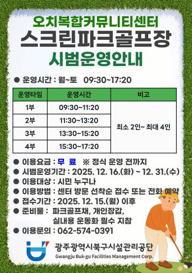 자세한 운영 안내는 광주광역시북구시설관리공단 홈페이지에서 확인할 수 있으며, 문의는 센터 안내데스크로 하면 된다.