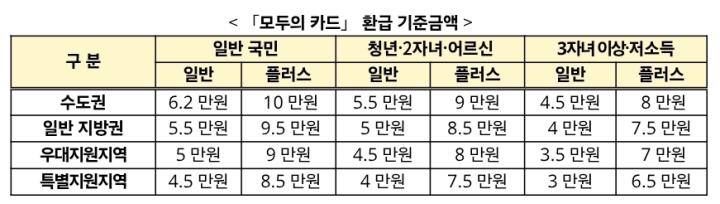 환급 기준금액은 대중교통 인프라 구축 상황 등을 고려하여 지역별, 인구감소 등에 따라 4개 지역(수도권, 일반 지방권, 우대·특별지원지역)으로 구분로 차등 적용하여 대중교통 이용이 상대적으로 어려운 지방 이용자도 실질적인 혜택을 누릴 수 있도록 한다.