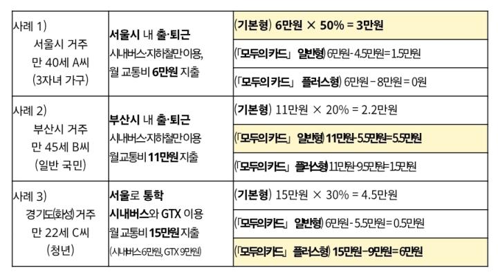 한 달 동안 환급 기준금액을 초과하여 대중교통비를 지출한 경우 초과분에 대해 모두 돌려받을 수 있는 「모두의 카드」를 도입한다. 이를 통해 출퇴근, 통학 등으로 대중교통을 자주 이용하는 이용자의 교통비 부담이 크게 줄어들 것으로 대중교통비 지출 금액의 상한선으로 이를 넘겨서 대중교통비를 지출하는 경우