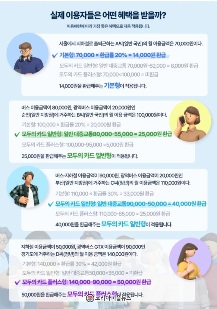 위 사례와 같이 통상 대중교통 이용 빈도가 낮은 경우에는 K-패스가 적용되고, 빈도가 높은 경우에는 모두의 카드(일반형, 플러스형)가 적용되며, 대중교통을 많이 이용할수록 환급 혜택도 더 커지게 된다.