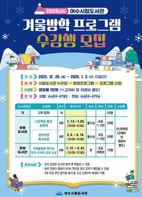 여수시 관계자는 “겨울방학을 맞아 초등학생들이 도서관을 통해 독서와 문화 활동을 접할 수 있도록 프로그램을 마련했다”며 “시민들의 많은 관심과 참여를 바란다”고 밝혔다.