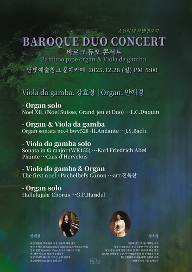 이번 공연은 2015년부터 꾸준히 진행해 왔던 담빛예술창고 대나무 파이프 오르간 정기연주회의 일환으로, 한 해를 마무리하는 의미에서 바로크 시대의 대표적 악기인 비올라 다 감바와 듀오 콘서트 형식을 빌어 서정성과 장엄함의 조화로움을 선사할 예정이다.