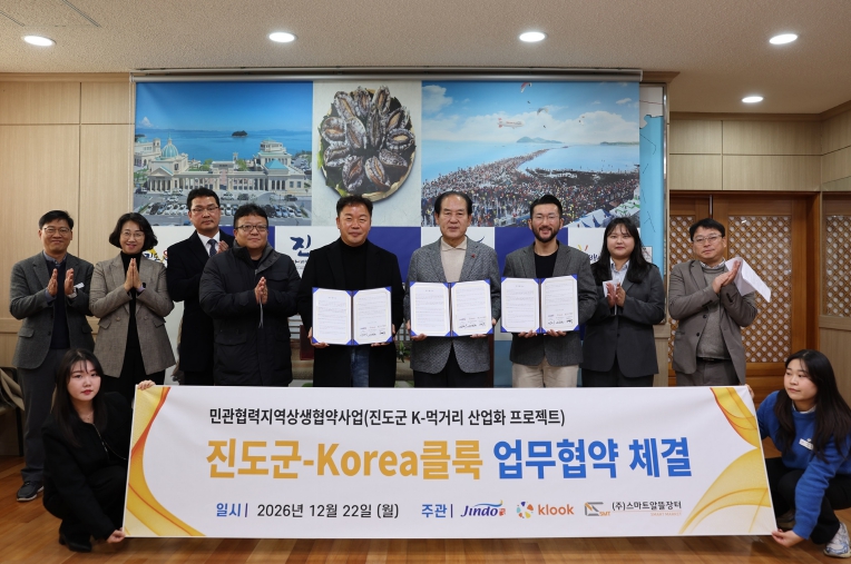 진도군은 지난 22일에 ‘클룩 트래블테크놀러지’와 업무협약을 체결하고, 국토교통부의 민관협력 지역상생 협약 사업 ‘케이-먹거리 산업화 프로젝트’를 본격적으로 추진한다.