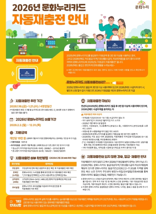 문화누리카드는 만 6세 이상 기초생활수급자와 차상위계층을 대상으로 문화예술·여행·체육 분야 이용을 지원하는 카드로, 무안군은 2026년 문화누리카드 지원금을 전년 대비 1만 원 인상해 1인당 15만 원을 지원할 계획이다.