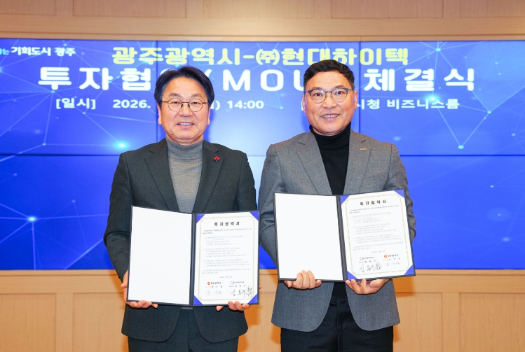 광주광역시는 ㈜현대하이텍과 26일 시청 비즈니스룸에서 ‘신규 차종 부품 제조공장 신설을 위한 투자협약’을 체결했다.