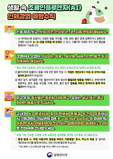 조류인플루엔자(AI) 인체감염증은 조류인플루엔자(AI) 바이러스에 사람이 감염되어 발생하는 급성 호흡기 질환이다. 주로 감염된 가금류 또는 오염된 환경과의 접촉을 통해 전파될 수 있으며 사람 간 전파 가능성은 매우 낮은 것으로 알려져 있다.