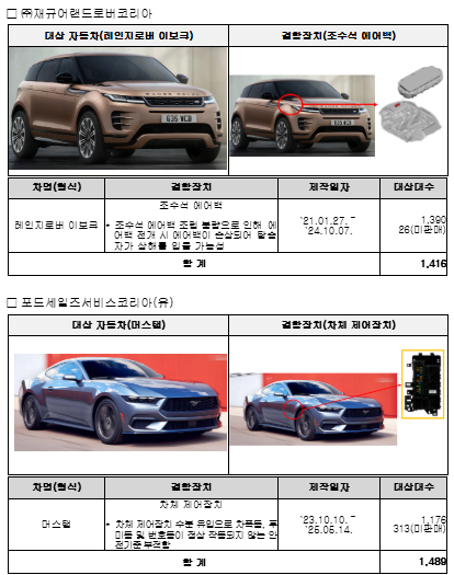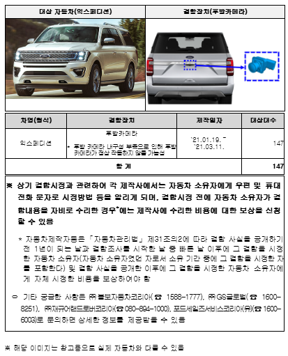 ➃ (포드) 머스탱 1,489대는 차체 제어장치 수분 유입으로 차폭등, 후미등 및 번호등이 정상 작동되지 않는 안전기준 부적합으로 1월 26일부터 시정조치를 진행하고 있고, 익스페디션 147대는 후방 카메라 내구성 부족으로 인해 후방 카메라가 정상 작동하지 않을 가능성으로 1월 26일부터 시정조치를 진행하고 있다.