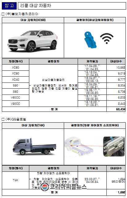 ① (볼보) XC60 등 7개 차종 50,434대는 비상자동제동장치 센서의 한계로 의도치 않은 자동 긴급 제동이 발생할 가능성으로 1월 26일부터 시정조치를 진행하고 있다.