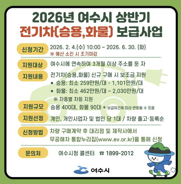 접수 기간은 2월 4일부터 시작되며 자세한 사항은 여수시청 누리집 고시공고 또는 무공해차 통합누리집에서 확인할 수 있다.
