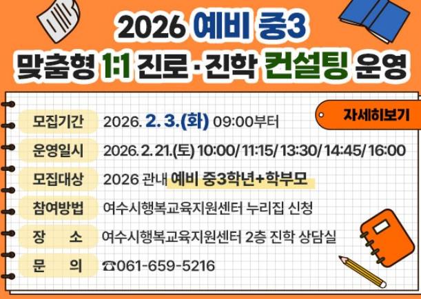 참여를 희망하는 학생과 학부모는 2월 3일부터 여수시행복교육지원센터 누리집을 통해 신청할 수 있다.
