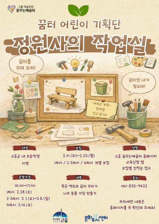 '정원사의 작업실'은 고흥 예술정원 꿈꾸는예술터의 주요 이용자인 초등학생들이 예술정원을 가꾸는 ‘정원사’가 되어 목공과 미술 활동을 통해 공간을 직접 개선해 나가는 참여형 문화예술교육 프로그램이다.