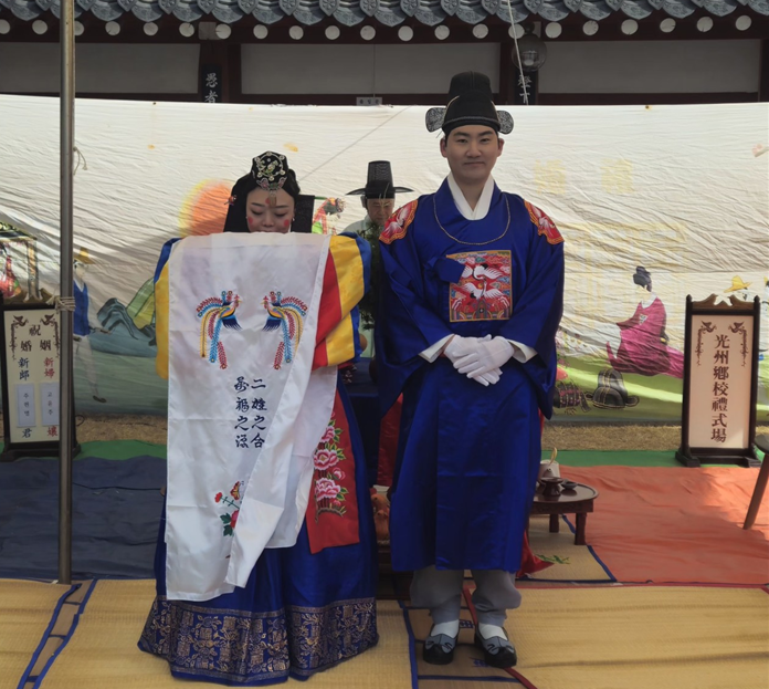 주례는 광주향교 송우상 부전교가 맡아, 혼례의 의미와 부부의 도리를 강조하는 주례사를 통해 “부부의 연은 예(禮)와 신의(信義) 위에 설 때 오래도록 화목하다”고 당부했고, 사회는 광주향교 경리과장 김옥이 맡아 전통 혼례 절차의 의미를 알기 쉽게 설명하며 진행을 도왔다.
