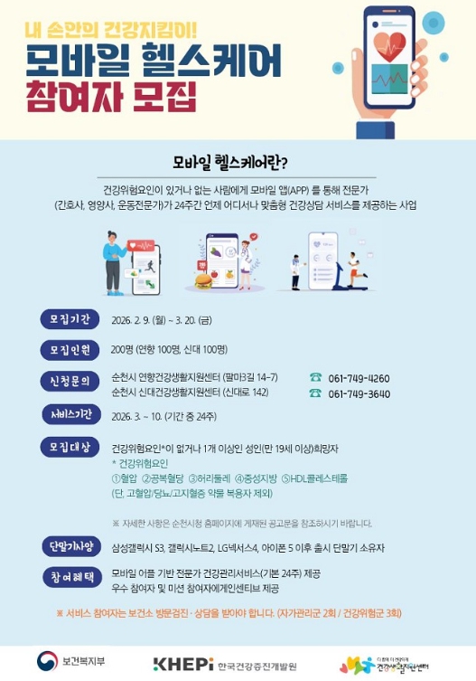 신청 기간은 2월 9일부터 3월 20일까지이며, 올해는 총 200명(연향 100, 신대 100)을 모집할 예정으로 신대, 연향 건강생활지원센터에 전화로 신청하면 된다.