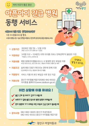광산구 관계자는 “출근길 아이가 갑자기 열이 날 때 부모님이 느끼는 막막함을 해소하는 것이 이번 사업의 핵심”이라며 “부모가 안심하고 믿을 수 있는 촘촘한 돌봄 체계로 아동의 적기 진료와 건강 회복을 밀착해 지원하며, 가정의 양육 부담도 덜어드리겠다”라고 말했다.