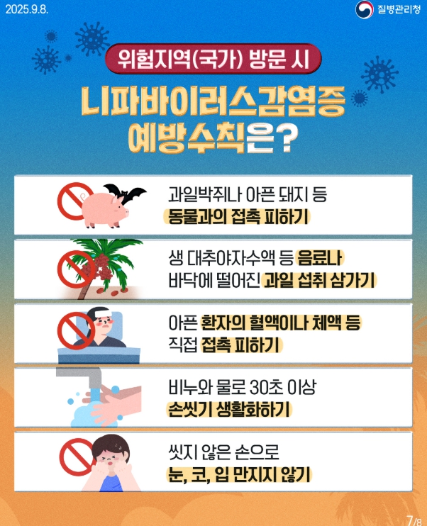 또한 인도·방글라데시 등 니파바이러스 발생 국가를 방문한 후 귀국 14일 이내 발열, 두통, 인후통 등 의심 증상이 있으면 즉시 질병관리청이나 관할 보건소로 신고해야 한다.
