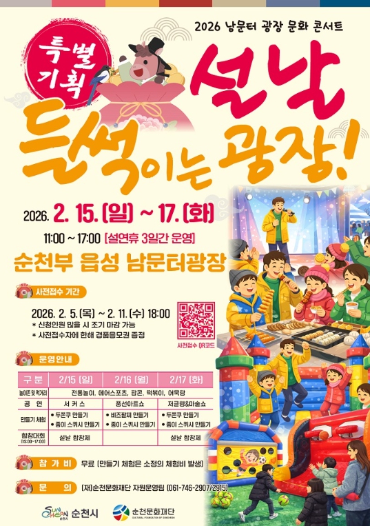 또한 두쫀쿠 만들기, 비즈팔찌 만들기, 종이 스퀴시 만들기 등 시민 참여형 프로그램과 함께 떡볶이·어묵탕 등 먹거리 부스도 마련된다.