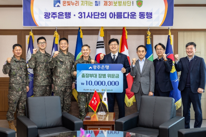 이날 전달식에는 김종민 광주은행 부행장과 김도열 제31보병사단 사단장 및 관계자들이 참석했으며, 지역 안보를 위해 헌신하고 있는 장병들의 노고에 깊은 감사의 뜻을 전하고 따뜻한 격려의 시간을 가졌다. 전달된 위문금은 장병들의 복지 향상과 사기 진작을 위한 다양한 지원에 사용될 예정이다.