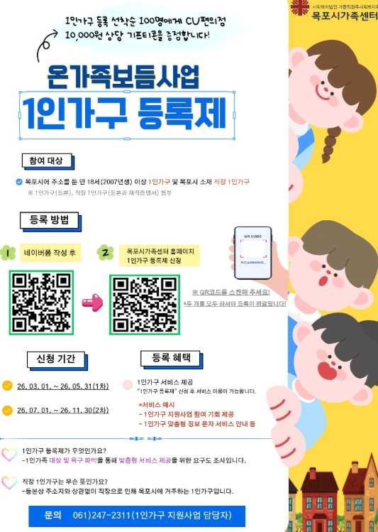 1인가구 등록 및 프로그램 신청 문의는 목포시가족센터 1인가구 지원사업 담당으로 하면 된다.