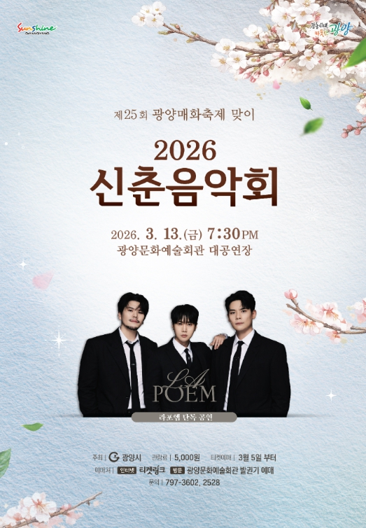 한편, 이번 공연은 전석 5천 원(총 490석)이며, 오는 3월 5일 오전 10시부터 티켓링크 누리집과 광양문화예술회관 방문을 통해 예매할 수 있다.