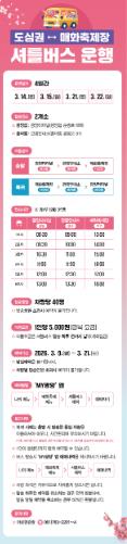 광양시 관계자는 “도심 셔틀버스 운영을 통해 교통 혼잡을 완화하고 방문객들에게 보다 안전하고 편리한 이동 환경을 제공할 것으로 기대한다”며 “사전예약제로 운영되는 만큼 이용을 희망하는 시민과 관광객은 정해진 기간 내 신청 및 요금 납부를 완료해 주시길 바라며, 대중교통과 셔틀버스를 적극 이용해 교통 분산과 원활한 축제 운영에 협조해 달라”고 당부했다.