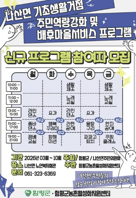 이번 프로그램은 나산면 기초생활거점 조성사업의 일환으로, 주민 삶의 질 향상과 지역 공동체 활성화를 위해 마련됐다.