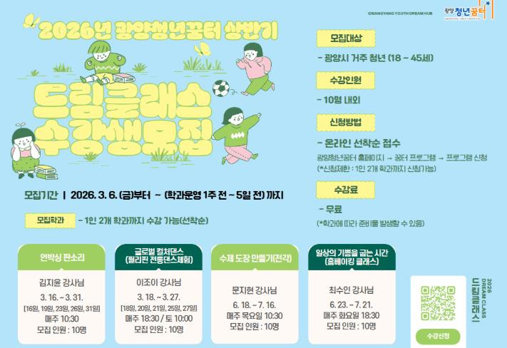 광양시 관계자는 “이번 드림클래스는 설계 단계부터 청년들의 의견을 반영한 만큼 참여 만족도가 높을 것으로 기대한다”며 “청년들이 꿈터에서 취미와 배움을 매개로 자연스럽게 교류하고 네트워크를 형성할 수 있도록 지원하겠다”고 말했다.