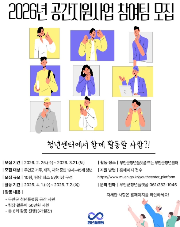 참여를 희망하는 청년팀은 무안군청년플랫폼 홈페이지를 통해 신청서를 작성해 온라인으로 접수하면 된다. 자세한 사항은 무안군청년플랫폼으로 문의하면 된다.