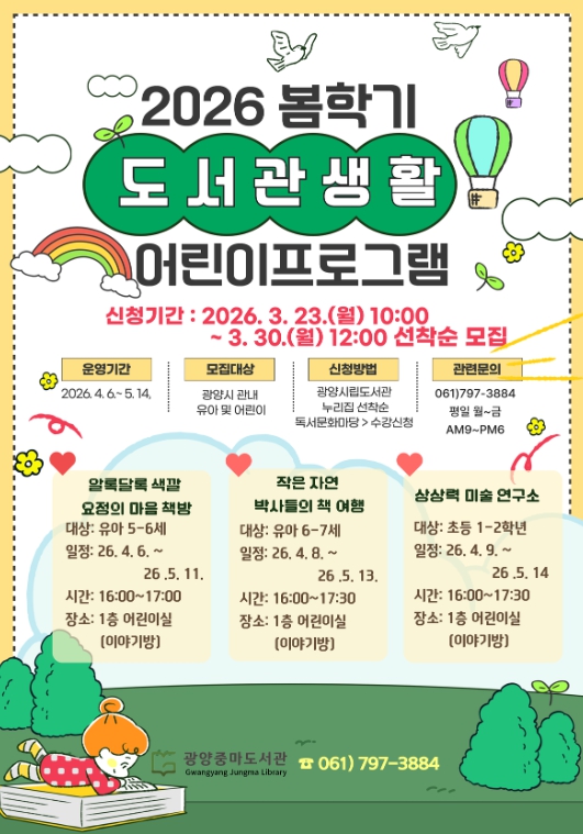 프로그램 내용과 신청 방법 등 자세한 사항은 광양시립도서관 누리집에서 확인하거나 광양중마도서관으로 문의하면 안내받을 수 있다.