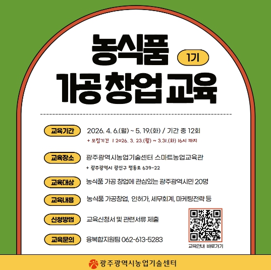 접수기간은 1기 3월 23일부터 31일까지, 2기 7월 6일부터 14일까지이다. 식품가공 및 창업에 관심 있는 광주시민이면 신청할 수 있으며, 서류 심사를 통해 교육생을 선발한다. 신청은 광주광역시농업기술센터 누리집(교육마당-교육안내)에서 확인할 수 있다.