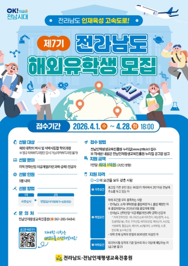 모집 대상은 공고일 현재 본인이나 부모가 2년 이상 전남에 주소를 두고 있으며, 전남지역 대학(원)을 졸업했거나 졸업 예정인 사람이고, 전남도 전략산업 관련 이공계열 전공자로 학업성적과 외국어 요건을 충족해야 한다.