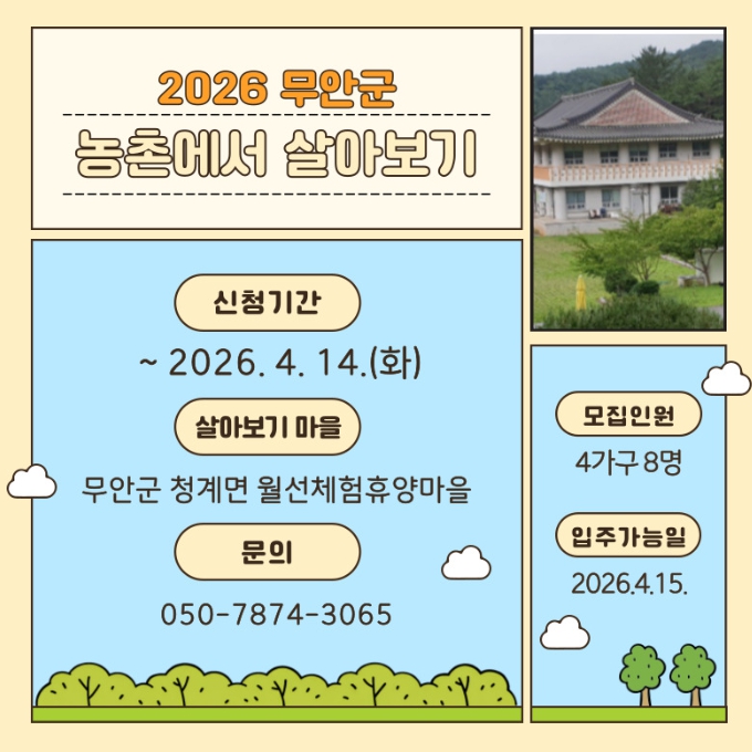 무안군은 2026년 운영 마을로 청계면 월선마을(월선체험휴양마을)을 선정하고, 타 시·도에 거주하는 도시민을 대상으로 프로그램을 추진한다. 참가자는 최장 3개월 동안 월선마을에 체류하며 다양한 농촌생활을 경험하게 된다.