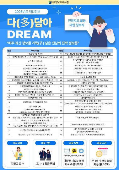 전성아 진로교육과장은 “급변하는 대입 환경 속에서 교사가 최신 정보를 신속하게 활용하는 것이 무엇보다 중요하다”며 “다(多)담아 DREAM 대입정보지가 학교 현장의 진학지도를 실질적으로 지원하는 핵심 자료로 자리 잡기를 기대한다”고 말했다.