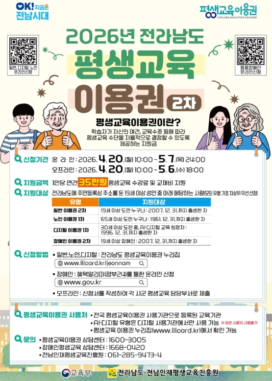 평생교육이용권 누리집을 통한 온라인 신청은 5월 7일까지 가능하며, 순천시 평생교육과 방문 신청은 5월 6일까지 접수한다.
