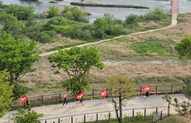 자발적으로 참여한 곡성군 직원들은 섬진강 일원 약 12km 구간을 달리며 산불 예방 문구가 적힌 깃발을 들고 강변을 따라 이동했다.
