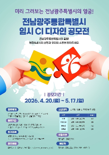 이길용 전남도 문화융성국장은 “이번 공모전은 전남광주통합특별시의 상징성과 정체성을 전 국민과 함께 만들기 위한 것”이라며 “통합특별시의 성공적 출범을 위해 국민께서 적극적으로 참여하길 기대한다”고 말했다.