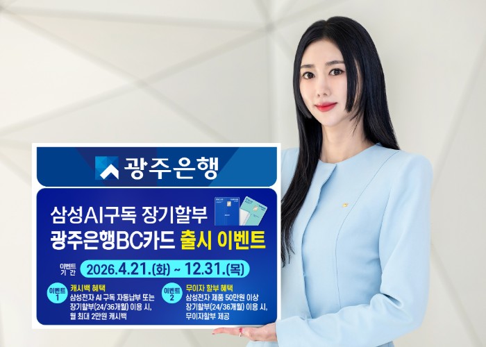 광주은행은 카드 출시를 기념해 2026년 12월 31일까지 이벤트를 진행한다. 행사기간 동안 삼성스토어에서 삼성전자 제품을 AI 구독클럽으로 구매하거나 24/36개월 장기할부로 구매할 경우, 무이자 할부 혜택은 물론 매월 카드 전월실적에 따라 AI 구독 자동납부 또는 장기할부 이용 범위 내에서 기본 캐시백 금액에 6,000원을 추가하여 매월 최대 2만원까지 캐시백 혜택을 제공한다.