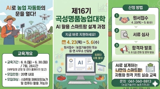 곡성군농업기술센터 관계자는 “이번 교육은 고비용 스마트팜의 장벽을 낮추고, 농업인이 AI를 활용하여 스스로 농장을 설계하는 혁신적인 실습 과정이 될 것”이라며, “디지털 농업으로의 도약을 꿈꾸는 열정 있는 농업인들의 많은 관심과 참여를 바란다”라고 전했다.