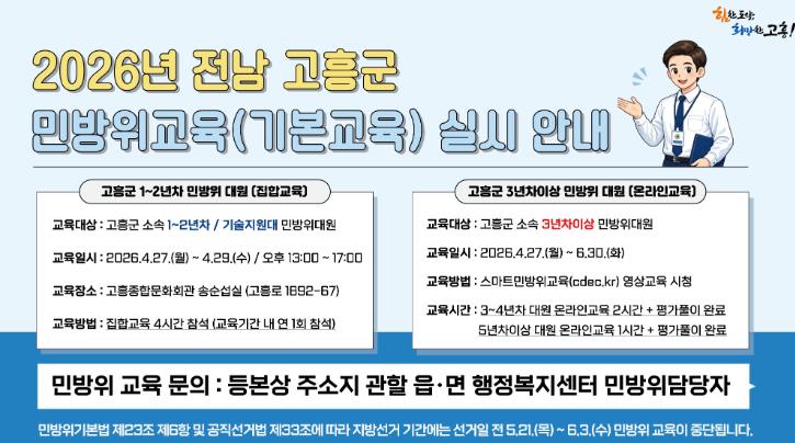 군 재난안전과 관계자는 “민방위대원은 연 1회 반드시 교육을 이수해야 하며, 미 이수시 과태료가 부과될 수 있다”며 “교육 미이수자를 대상으로 하반기 보충교육을 2회 추가 실시해 모든 대원이 교육받을 수 있도록 운영할 계획이다”고 말했다.