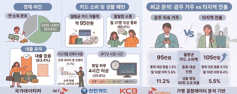 광주 거주 1인 가구와 타지역 전출 가구를 비교 분석한 결과도 눈에 띄었다. 타지역 전출 가구는 광주 거주 가구보다 고소득 비율(연 소득 4000만원 초과)과 카드 소비액(평균 105만 원)이 높았으나, 통화 대상이 없거나 외출 빈도가 낮은 등 사회적 고립 가능성은 오히려 더 높게 나타났다.
