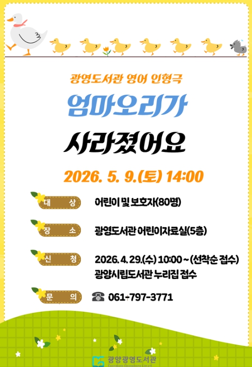 이번 공연은 아기 오리들이 사라진 엄마를 찾아 나서는 여정을 그린 영어 창작 인형극으로, 어린이들이 이야기를 따라가며 가족의 소중함을 자연스럽게 느낄 수 있도록 마련됐다.