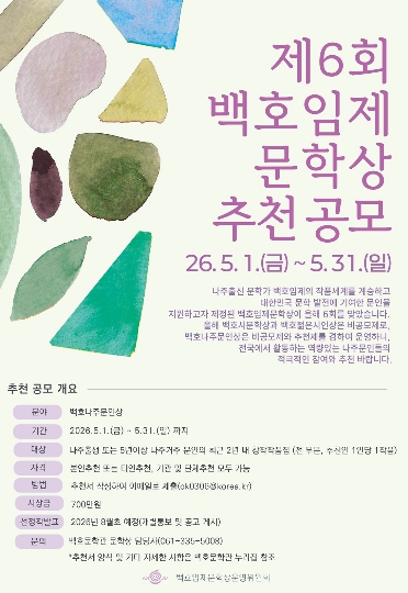 곽효환 백호임제문학상운영위원장은 “지역 문인들이 신뢰하는 문학상이 될 수 있도록 공정하고 투명하게 운영하겠다”며 “전국에서 활동하고 있는 역량 있는 나주 문인에 대한 많은 관심과 추천을 바란다”고 밝혔다.